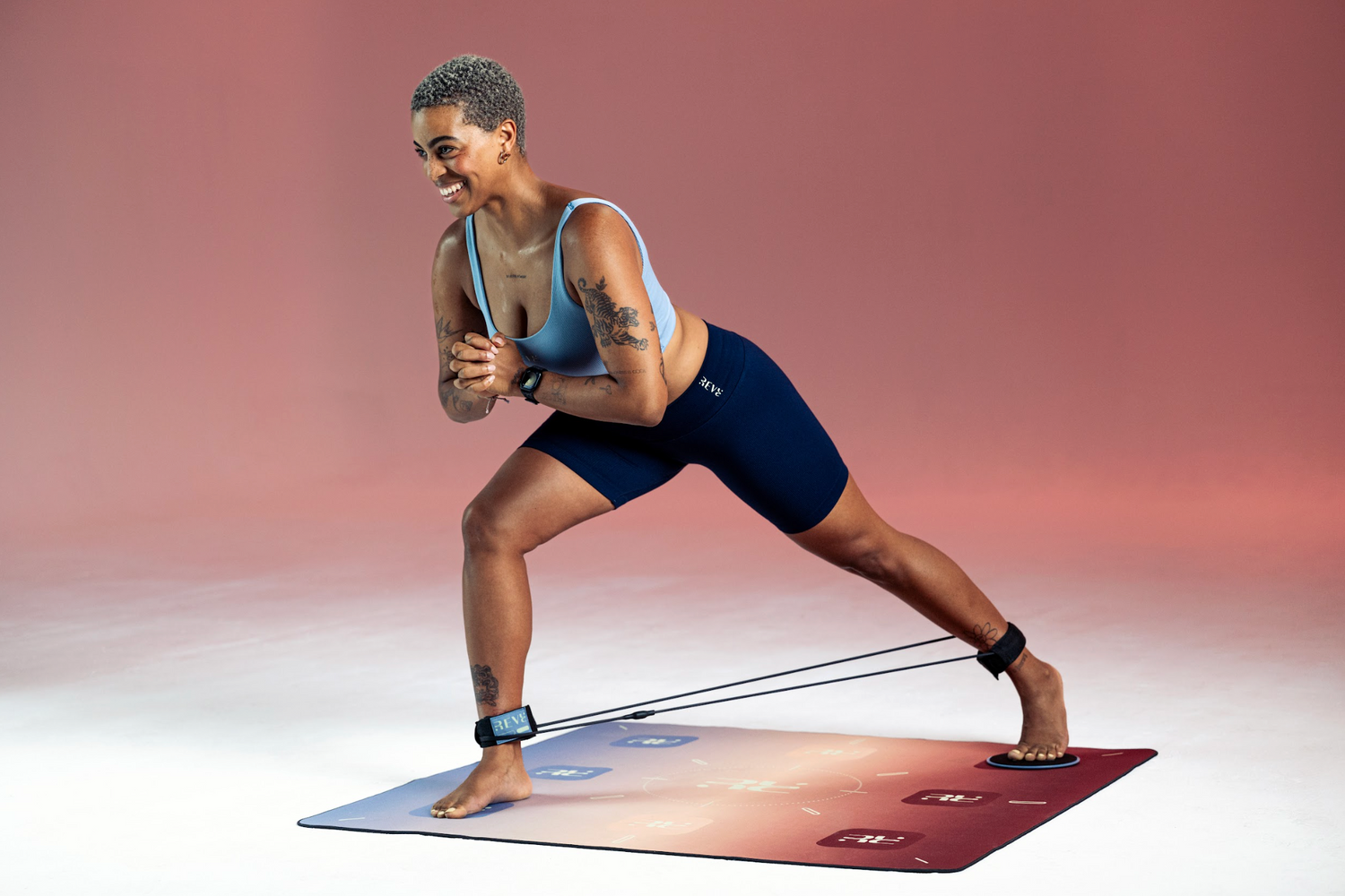 50 minutes de renforcement intelligent full body, inspirées du Reformer, SANS MACHINE, avec les accessoires R.EVE (sliders, straps, trio ect.)